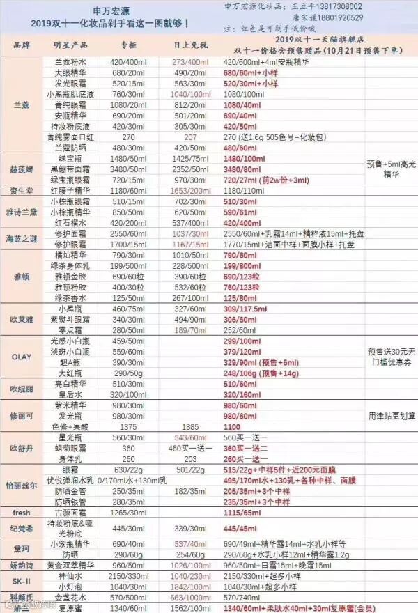 申万宏源这两位分析师,认真比较了19个品牌51种主打产品的专柜价、日上免税店价格和天猫旗舰店“双十一”预售价格,并强调“红色为剁手低价”,不但比较了价格、容量,还对赠品、小样等做了统计。