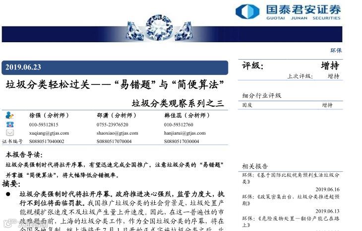 会生活的分析师,一定不会错过2019年的垃圾分类。国泰君安证券的《垃圾分类 轻松过关 —— “易错题”与“简便算法”》,你不容错过。