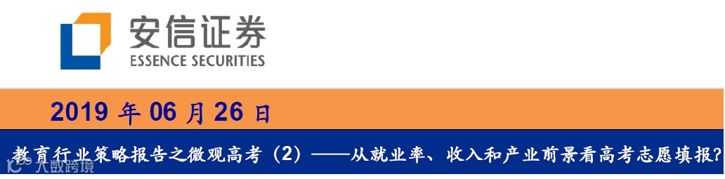 选好学校了,不知道该选什么专业,那么可以参考安信证券的《教育行业策略报告之微观高考(2)——从就业率、收入和产业前景看高考志愿填报?》,从多个角度理性探讨专业的选择,以及将来孩子在这个行业能得到怎样发展。