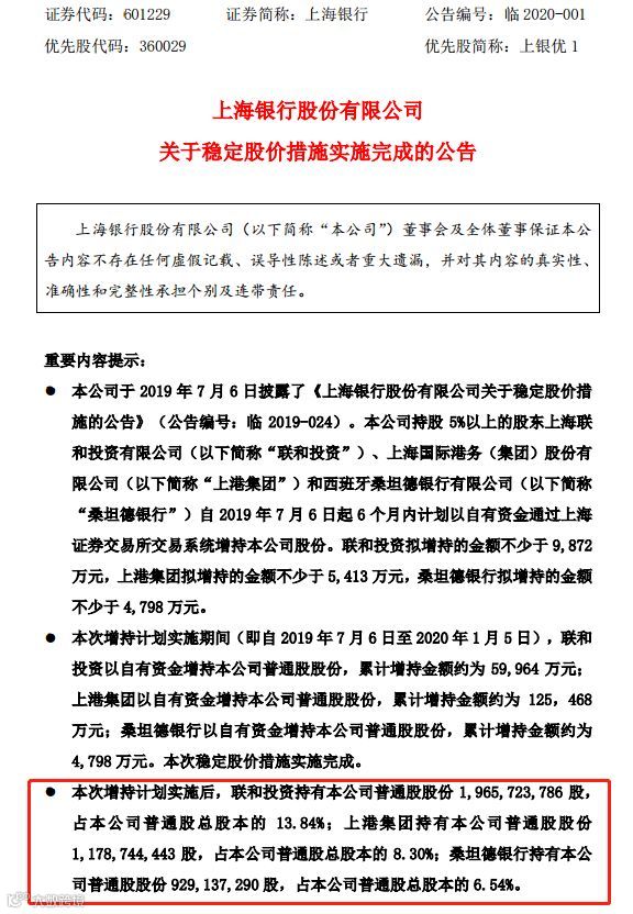 1月6日晚间,上海银行晚间公告,公司稳定股价措施实施完成,实施期间(即自2019年7月6日至2020年1月5日),股东联和投资累计增持金额约为6.00亿元,股东上港集团累计增持金额约为12.55亿元,股东桑坦德银行累计增持金额约为4798万元。