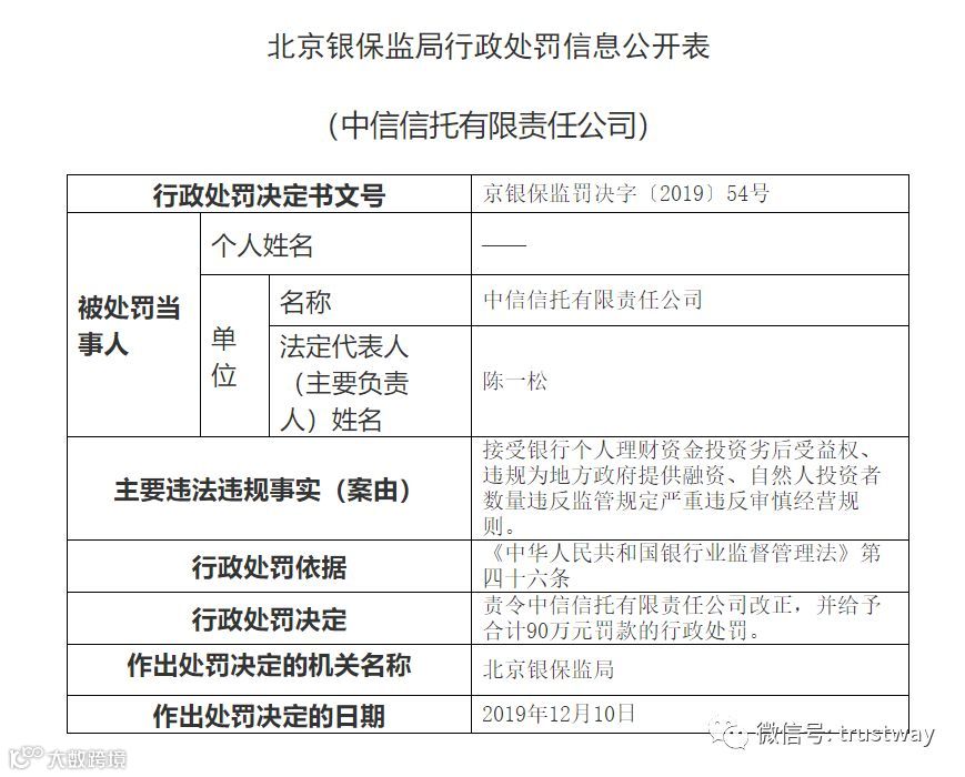 多位受访者称,“2019年,应该是中信信托多年来首次被罚。”