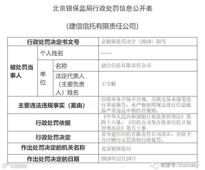 根据监管部门公示信息,12月10日,中信信托建信信托收到90万元罚单。