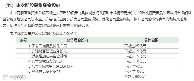 根据配股预案,天风证券计划将80亿元主要用于子公司增资及优化布局、加强财富管理业务投入、适度增加证券自营规模、加大研究业务的投入、加大IT技术平台建设的投入以及其他营运资金安排共6大方面。