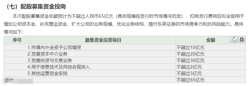 根据公告,东吴证券的配股比例同样为每10股配售3股,计划向全体股东配售不超过8.99亿股新股,募集资金不超过65亿元。而从募资用途来看,东吴证券将资金主要划分为发展投资与交易业务、发展资本中介业务、向境内外全资子公司增资、用于信息技术及风控合规投入以及其他运用资金安排5个方面。
