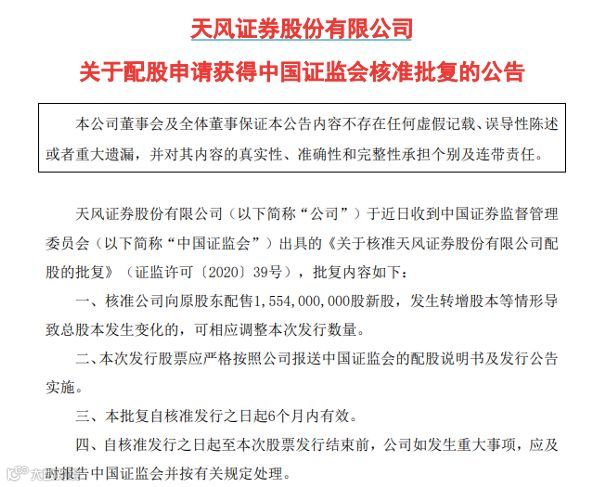 17日晚间,天风证券80亿元的配股项目终于拿到了证监会批文。