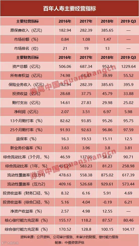 中债资信在报告中表示,百年人寿2019年2季度风险综合评级为C类,目前尚无法获知具体原因,推测或为公司2季度综合偿付能力充足率处于100%-120%之间所致。对于C类公司,监管可采取的措施包括责令调整业务结构、限制业务范围、责令调整资产结构或交易对手、责令增加资本金等。