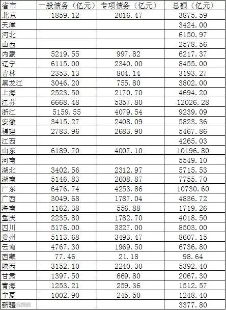 据统计,政府债务总额前四名是:江苏 (12026.28亿元)、广东 (10730.60亿元)、山东 (10196.80亿元)、贵州 (8607.15亿元)。