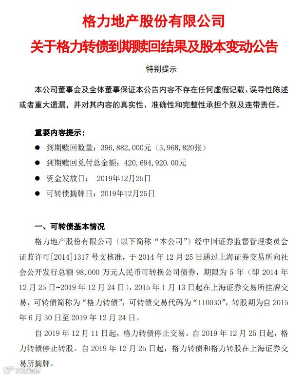 发行5年之后,格力转债于12月25日到期,从上交所摘牌退市。