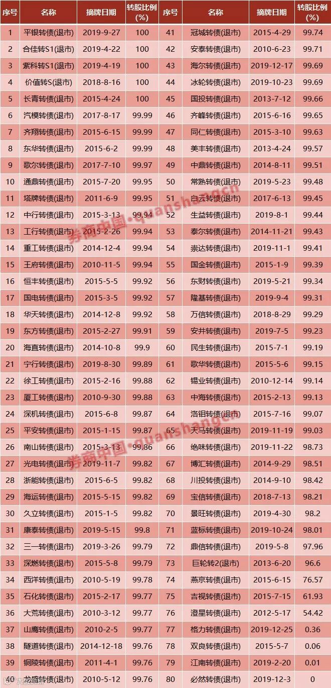 Wind数据显示,2010年至今,在有数据统计的80只摘牌可转债中,共有73只的转股比例高于90%,占比高达91.25%。其中,包括今年摘牌的平银转债、合佳转S1、紫科转S1在内的多只转债的转股比例更是高达100%。