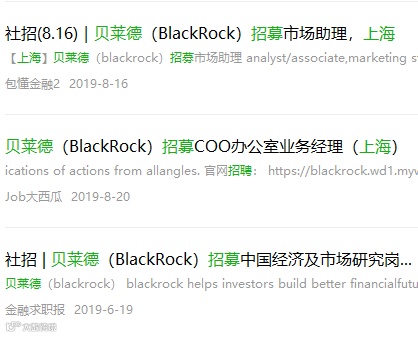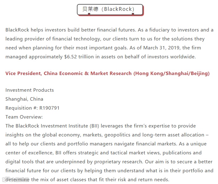 今年下半年,贝莱德曾放出大量招聘职位,包括市场助理、COO办公室业务经理和中国经济及市场研究岗等。