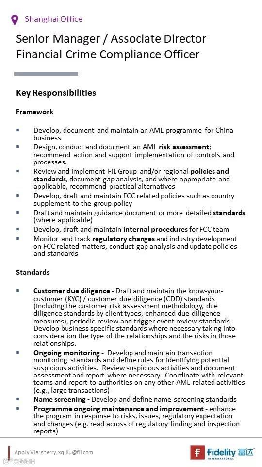 富达国际也于11月底发布了相关招聘信息,招聘职位为金融犯罪合规官。主要职责为制定、记录和维护反洗钱计划,设计、实施和记录反洗钱风险评估,客户类型尽职调查标准,制定和维护交易监测标准等涉及金融安全的一系列工作。这些工作内容需要依据中国本土的相关政策条例实施,此类职位也是外资私募为了更好地适应中国本土的金融规章制度所设立,对于公司的合规发展具有重要意义。