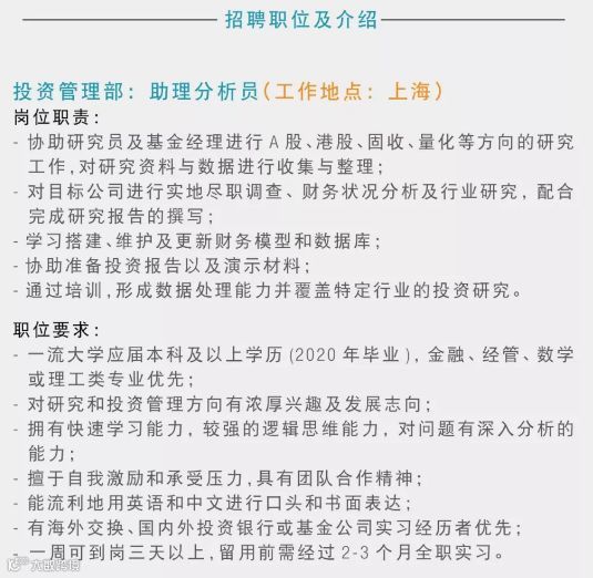 市场、投研和运营均放出了招聘岗位。与主流基金公司招聘要求相似,惠理偏爱金融或理工背景的2020应届毕业生,除此之外,由于是外资机构,海外留学经历在应聘时会获得加分。而在留用前,2~3个月的实习磨合期是惠理所有招聘岗位的一致要求。