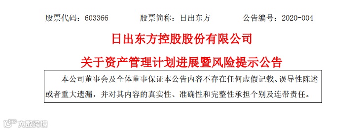 日出东方1月5日晚公告,公司此前以5000万元认购首誉光控资产管理有限公司发行的首誉光控-瑞丰2号专项资产管理计划(简称“瑞丰2号”),2019年12月24日为首誉光控-瑞丰2号专项资产管理计划预计到期日,公司尚未收到资产管理人关于该计划后续展期或清算安排。2020年1月3日,合伙人会议就有限合伙企业后续延期或清算安排等事项进行商议,会议当天尚未形成决议。项目存在延期或无法全额收回的风险。