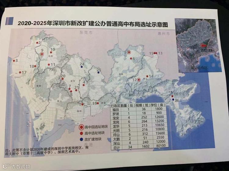 目前深圳规划了4座“高中园”,下图为深圳市新改扩建公办普通高中布局选址示意图: