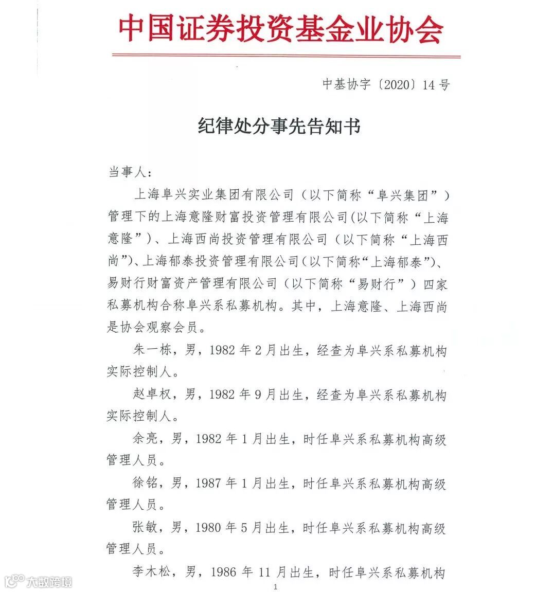 基金业协会发出的告知书显示,上海阜兴实业集团有限公司(以下简称“阜兴集团”)管理下的上海意隆财富投资管理有限公司(以下简称“上海意隆”)、上海西尚投资管理有限公司(以下简称“上海西尚”)、上海郁泰投资管理有限公司(以下简称“上海郁泰”)、易财行财富资产管理有限公司(以下简称“易财行”)四家私募机构合称阜兴系私募机枃。其中,上海意隆、上海西尚是协会观察会员。