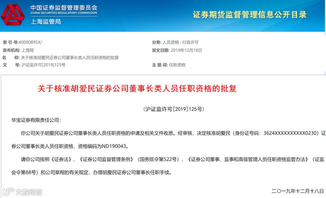 12月18日,华宝证券新任董事长胡爱民的任职资格获批。据悉,胡爱民现任中国宝武钢铁集团有限公司产业金融发展中心总经理、华宝投资有限公司总经理。