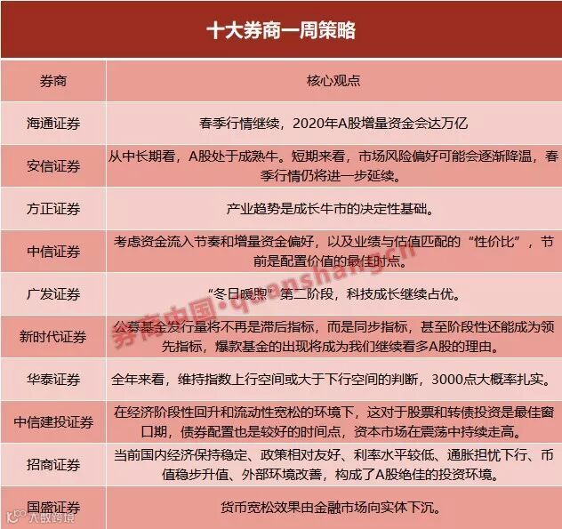 中信建投策略报告认为,在经济阶段性回升和流动性宽松的环境下,这对于股票和转债投资是最佳窗口期,债券配置也是较好的时间点,资本市场在震荡中持续走高。从行业配置上来看,首先,半导体为代表的电子、云计算和国产软件为代表的计算机行业持续景气,科技50为代表成长股持续推荐。其次,券商板块业绩表现优异,而且预期2020年资本市场将更加活跃,券商板块也是优先配置的方向。