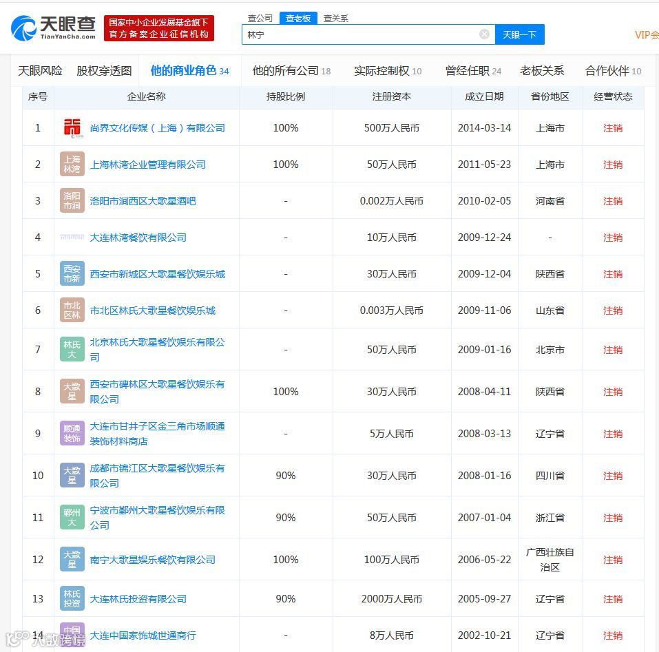 与前首富父亲相比,王思聪母亲林宁来的低调得多,鲜少暴露在公共视线当中。此次也是因为儿子救急才被媒体关注。据媒体报道,林宁为林氏投资集团的董事长,与万达集团渊源颇深。不过,根据天眼查信息显示,林宁目前担任法人/股东/高管的数十家企业绝大多数处于注销或吊销状态,包括大连林氏投资有限公司在内。