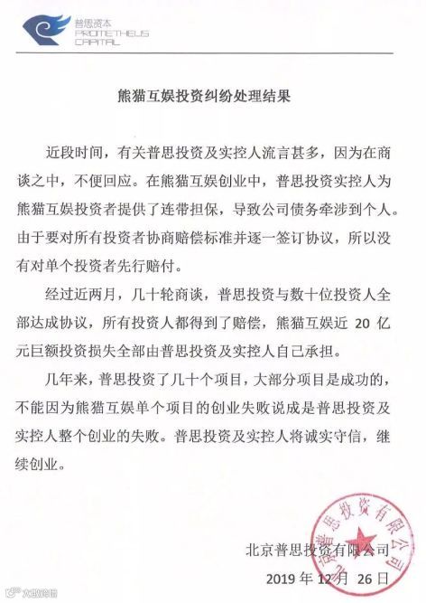 12月26日,王思聪旗下投资平台普思投资官网公布了熊猫互娱投资纠纷处理结果。普思投资表示,经过近两月几十轮商谈,普思投资与数十位投资人全部达成协议,所有投资人都得到了赔偿,熊猫互娱近20亿元巨额投资损失全部由普思投资及实控人承担。
