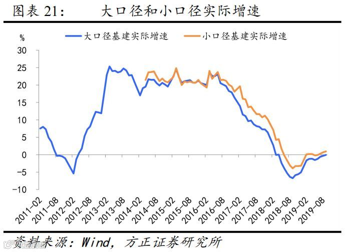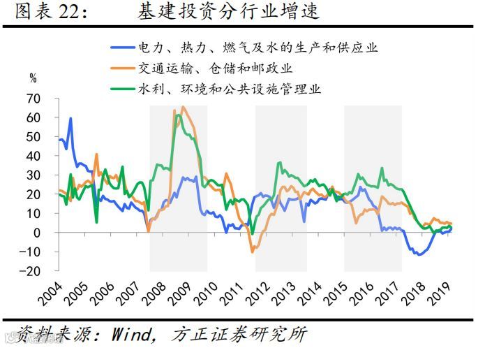 今年基建投资实际增长为零,低位回升主要靠中央发力。扣除价格后,今年大口径基建同比在零附近,小口径基建增速也不到1%(图表21),明显弱于市场的预期。究其原因,主要在于基建发力的主力--地方政府受到债务管控的约束(体现在以地方主导的、历次逆周期基建发力期间大幅回升的水利、环境和公共设施管理业在今年并未出现明显改善);今年基建投资的弱势回升主要靠中央发力(体现在中央主导的交通运输和电热燃水投资回升明显)(图表22)。