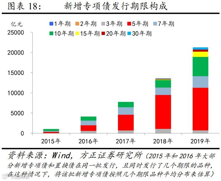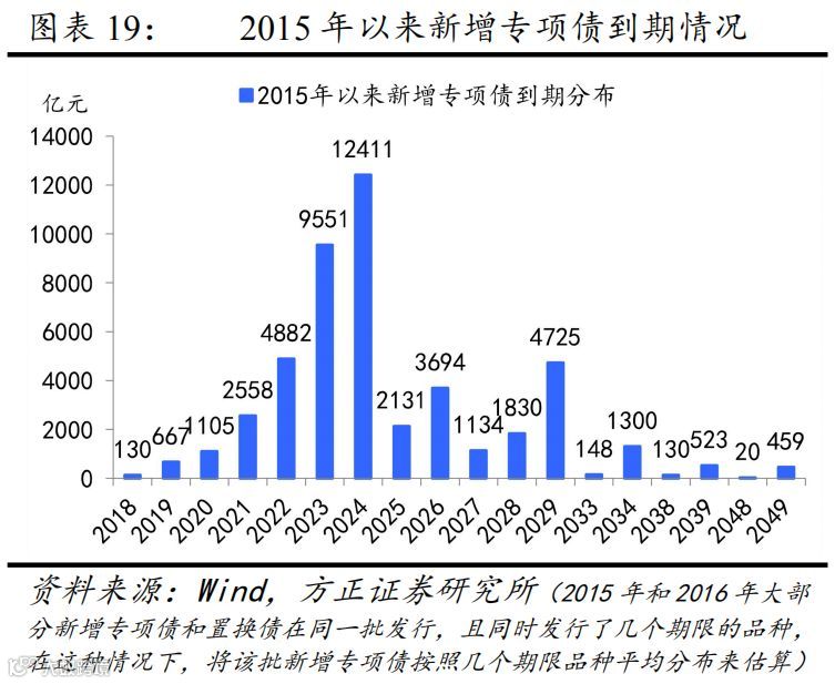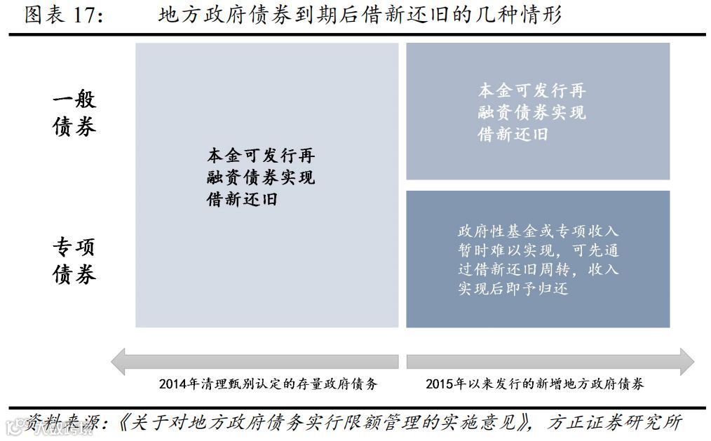 2015年实施新预算法后的新增专项债借新还旧有约束。我们在此前的专题报告《【方正宏观】一文读懂地方债运行机制 ——“财政稳增长”之分析框架系列一(下)》中对专项债的借新还旧作了明确:2015年实施新预算法后的新增专项债借新还旧仅限于临时周转(项目期限和专项债期限不匹配时),否则要以项目收益和政府性基金对应的专项收入进行偿还(图表17)。