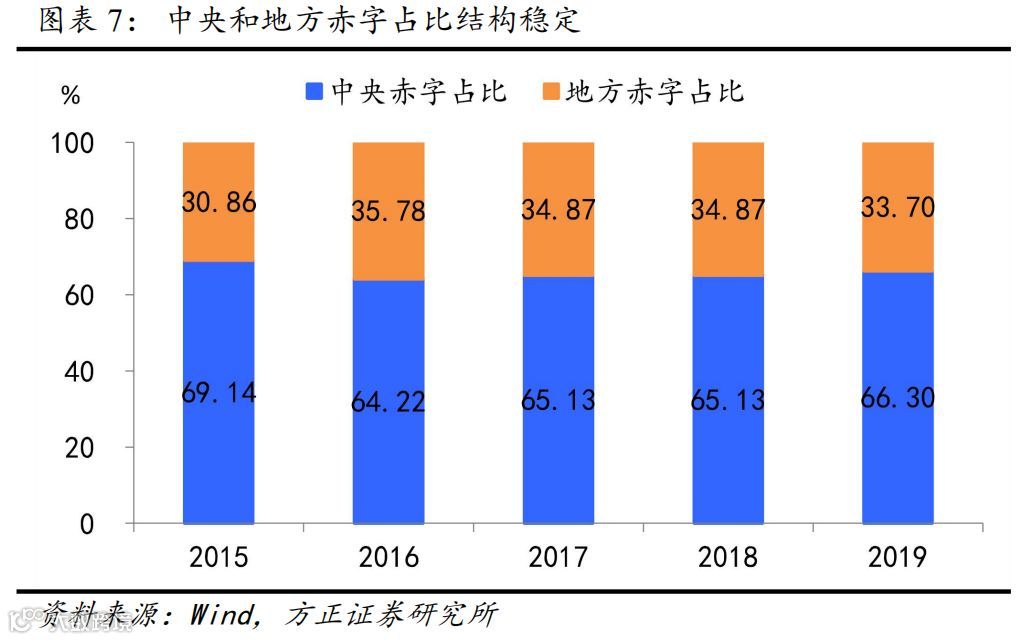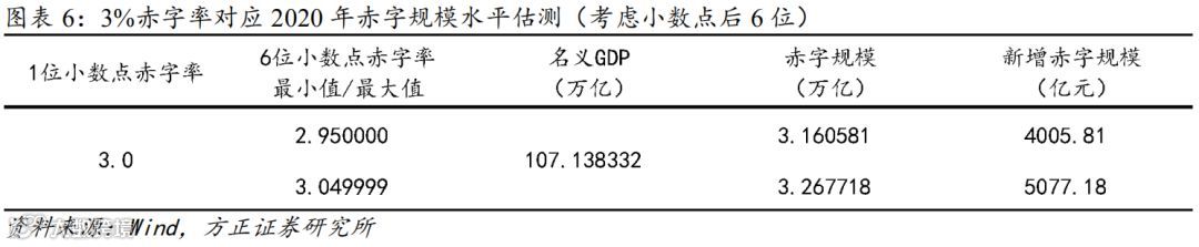 猜想一:赤字率不破“3”,赤字规模增长4000-5000亿。预计赤字率小幅提升至3%;鉴于2020年结构性通胀抬升GDP平减指数和“四普”提升名义GDP绝对水平,预计2020年赤字规模将达到3.16-3.27万亿左右,相较2019年增长4000-5000亿元。