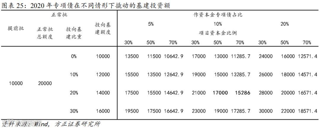 稳基建措施频出着力点在专项债,明显扩大专项债的基建杠杆。从允许专项债作项目资本金,到扩大使用范围,降低项目资本金比例等,今年多项措施出台,从专项债着力助力稳基建。理论上,专项债基建杠杆(发行一单位专项债产生的基建投资)可以从原来的0.3倍扩大的1.4倍左右,提前下达的2020年1万亿专项债不可用作土储和房地产,这种情况下专项债的基建杠杆理论上甚至可以扩大到2.1倍(图表23)。