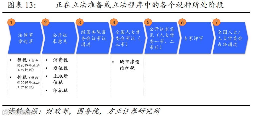 猜想四:税改的推进主要围绕“落实税收法定原则”展开。2020年为落实“税收法定”原则的最后一年,关税、消费税等7大税种立法进程有望明显提速,房地产税立法进程也有望取得突破。