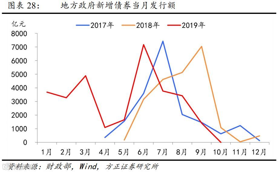 专项债增量或更多向基建倾斜。从结构来看,以往投向棚改、土储和基建三部分占比均在1/3左右(图表9)。由于国常会要求今年提前下达的1万亿专项债不能投向土储和房地产相关项目,乐观情形下,假定扣除提前批后余下的专项债投向结构保持稳定,即意味着专项债增量部分全部流入基建,而房地产相关的土储和棚改专项债规模基本持平今年的水平。但更可能的情形是,由于满足专项债收益要求的基建项目不足,或致明年3月份下达的余下专项债投向基建的占比会低于30%。
