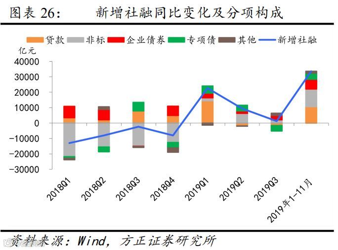 2019年专项债对社融扰动节奏为前高后低。2019年专项债对社融存量同比的拉动较去年提高了0.1个百分点。节奏上,由于2018年底提前下达了2019年专项债额度8100亿元,今年一季度实际发行了专项债6661亿元,意味着今年专项债的增量部分几乎绝大部分体现在一季度,也是一季度天量社融的原因之一。