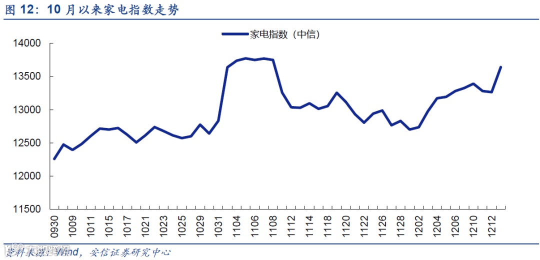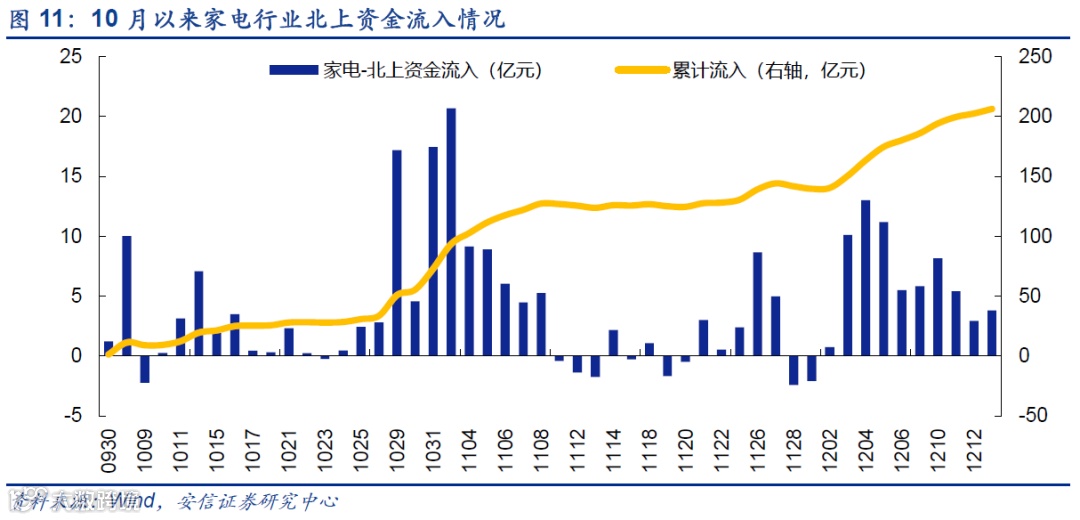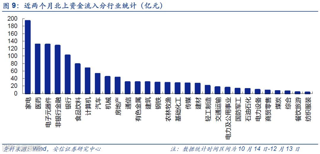 外资增配家电板块:家电板块近3个月以来的行情走势与外资流入关系密切。10月底外资大幅流入后家电板块在11月初大幅上涨,12月初以来外资的流入又再次推升了家电板块。