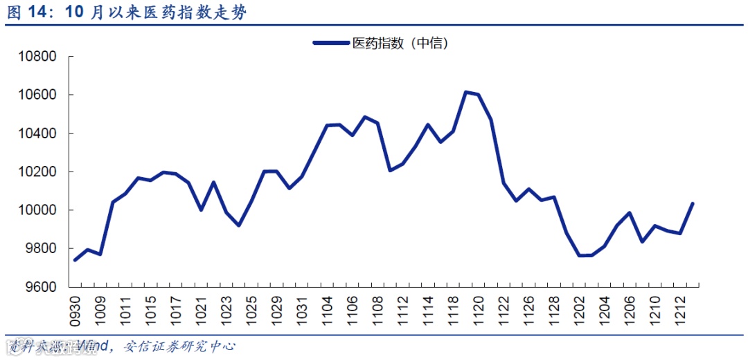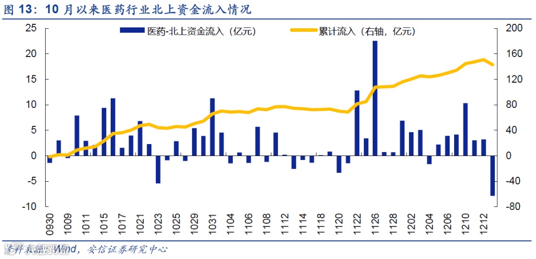 外资增配医药板块:近3个月以来医药板块主要10月和12月两阶段迎来了大量外资流入,其中10月外资流入催生了一波医药板块的上涨行情,11月医药板块在高位并未获得大量外资流入,直到12月医药板块回调后再次迎来外资入场布局。