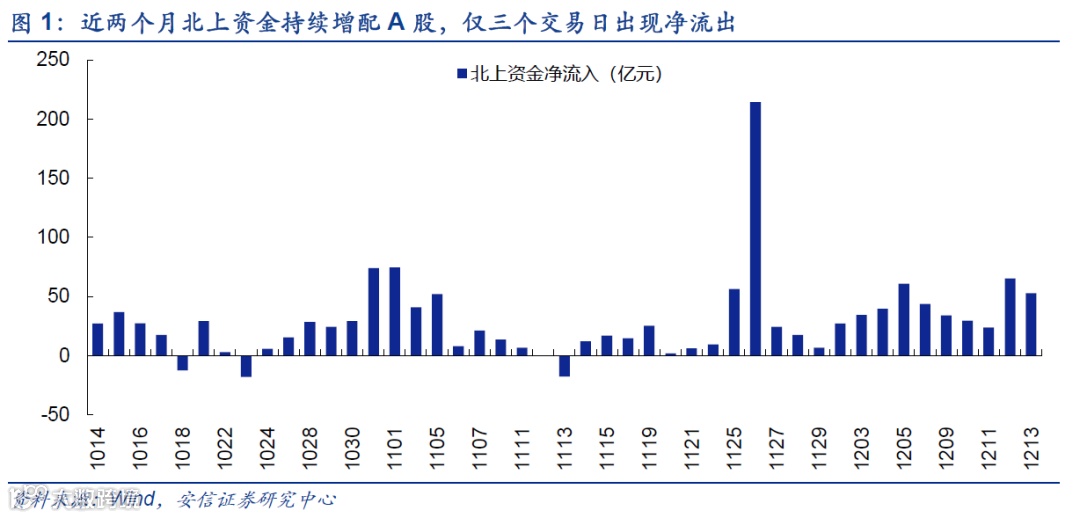 11月中下旬之后,北上资金流入A股的速度明显增快,对A股大盘和部分行业板块形成了有力支撑。11月,北上资金净流入604亿元,更超市场预期的是,在MSCI 11月26日扩大A股纳入因子后,北上资金流入A股势头并没有减弱甚至在增强,A股12月仅上半月就已流入411亿元,超过了11月上半月。