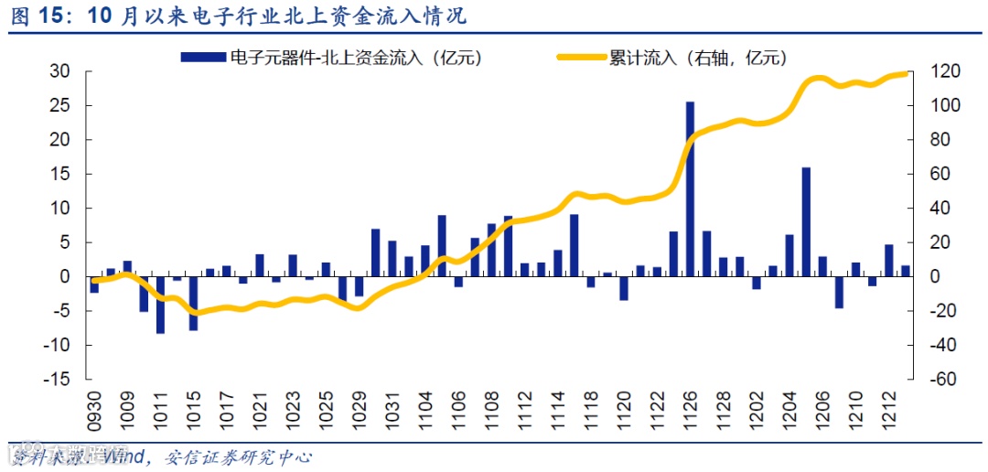 外资增配电子板块:今年10月之前的电子股行情,基本是由内资推动,外资流入较少。值得注意的是,11月以来外资显著增加了对电子板块的配置,并屡屡逢低布局加仓。电子指数也在12月以来不断走高。