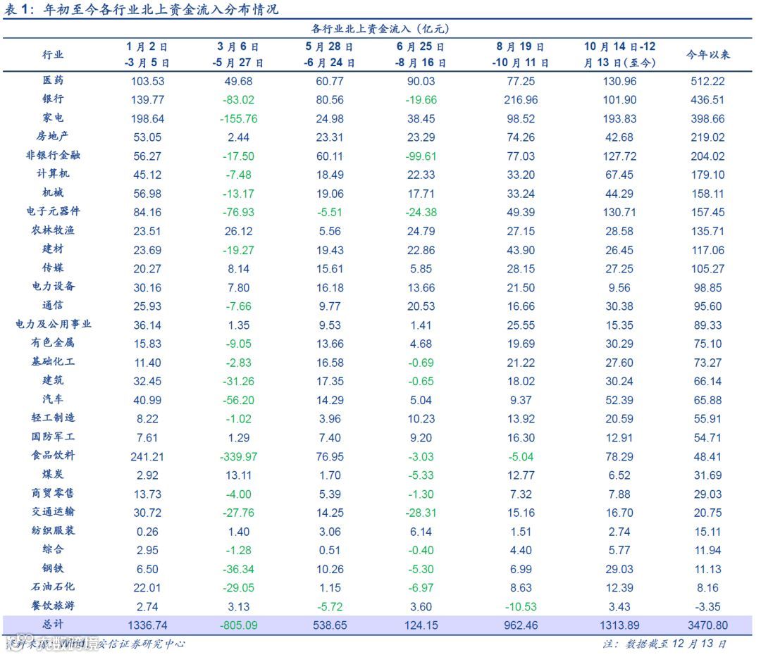 与之前的专题报告中的分析方法相同,我们依然通过对数据进行处理,剔除股价涨跌的因素后,对年初至今各行业北上资金流入情况进行估算,结果如下表所示。测算结果表明,近两个月外资流入最多的行业分别是家电(194亿)、医药(131亿)、电子(131亿)、非银(128亿);银行流入外资102亿,与九、十月相比明显回落;食品饮料与计算机的外资流入有所回升分别流入78亿和67亿;餐饮旅游和纺织服装继续成为外资流入最少的行业。总的来看,外资配置的行业偏好依然十分明显,但家电、电子、非银出现了明显的增配。