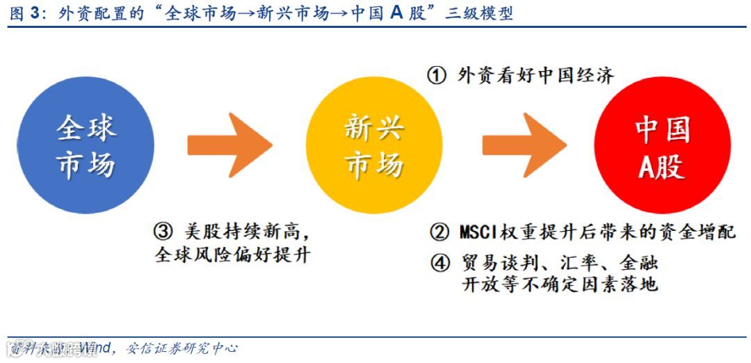 在我们此前的专题报告《聚焦北上资金:A股外资的新动态与未来》中,我们曾经指出,外资的配置通常受“美股→新兴市场资产→中国A股”这一模式的影响。现在,我们将其进一步改进为外资配置的“全球市场→新兴市场→中国A股”三级模型。这一模型让我们可以站在全球配置的视角理解外资:在外资的全球配置中,通常有一个比例的资产将投资到新兴市场当中,而其配置的新兴市场资产中,又会按一定的比例配置到中国A股。目前新兴市场中配置A股的比例还相当低,MSCI近期也仅是将权重从约3%调至约4%。