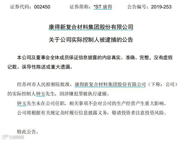 12月16日晚间,*ST康得发布公告称,公司实际控制人钟玉因涉嫌犯罪被执行逮捕。此时,距离今年5月张家港市公安局官微“官宣”钟玉被采取刑事强制措施的消息,已是半年有余。上月,曾有“康得新原董事长钟玉已取保候审”的消息在网络上传播,此次公告可算是对这一消息的官方辟谣。