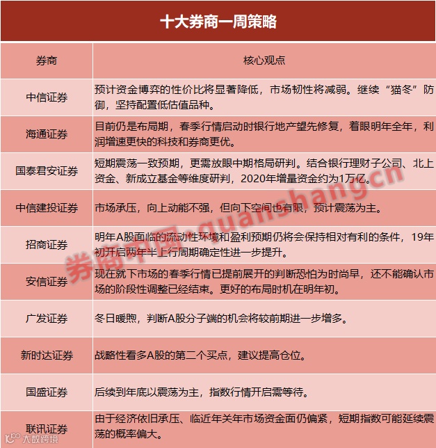 站在自上而下的角度,本周市场如期出现了小幅反弹,近期全球经济数据也都出现了积极信号,投资者情绪也普遍出现改善。但由于通胀预期依然存在上行风险、股票市场供给增加、签署第一阶段协议时间尚不确定、年底投资者可能有一定盈利兑现操作等因素影响下,安信证券认为现在就下市场的春季行情已提前展开的判断恐怕为时尚早,还不能确认市场的阶段性调整已经结束。