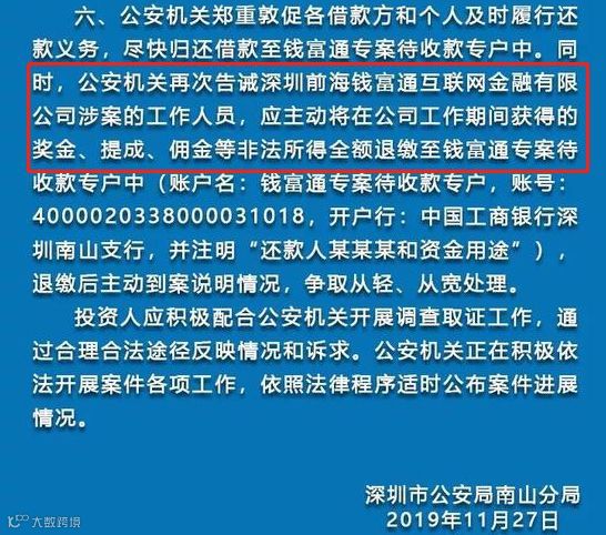 深圳市公安局南山分局敦促各借款方和个人及时履行还款义务,尽快归还借款至钱富通专案待收款专户。同时,公安机关再次敦促钱富通涉案工作人员,应主动将在公司工作期间所得奖金、提成、佣金等非法所得全额退缴至钱富通专案待收款专户,追缴后主动到案说明情况,争取从轻、从宽处理。
