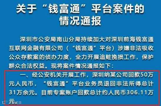 其中,钱富通涉嫌非法吸收公众存款罪,经公安机关开展工作,深圳纳某公司回款50万元,“钱富通”平台员工退回非法所得总计31万余元。目前专款账户回款总计306.11万元。
