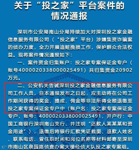 公安机关告诫投之家工作人员,自通报发布之日起,应主动将在公司工作期间获得的奖金、提成、佣金等非法所得全额退缴至投之家专案保证金专户中。