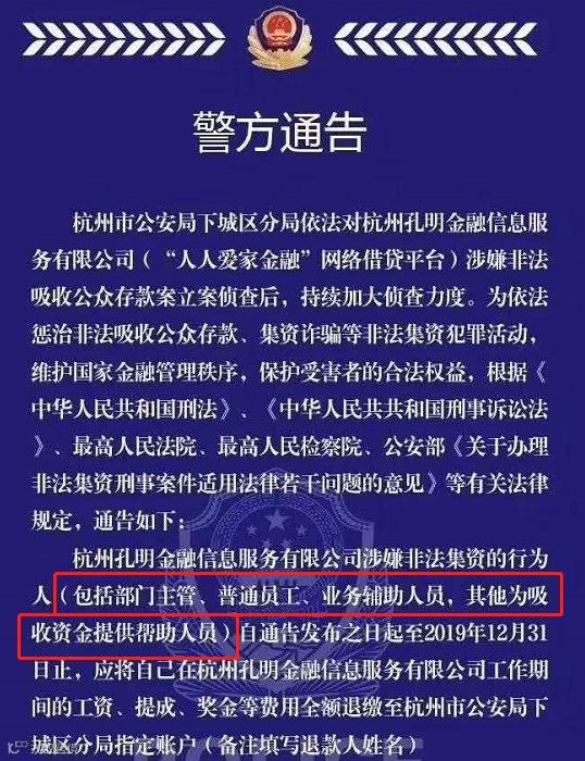 而在11月下旬,备受关注的“人人爱家金融”特大非法集资案也有了最新进展,杭州公安局下城区分局此前发布公告,要求该公司涉嫌非法集资的员工将自己工作期间的工资、提成、奖金等费用全额退缴。
