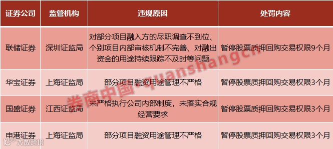 12月20日,因股票质押业务收到证监系统罚单,联储证券、华宝证券、国盛证券、申港证券4家券商被深交所给予纪律处分,暂停其股票质押业务权限。其中,联储证券被暂停9个月,其余3家券商均被暂停3个月。