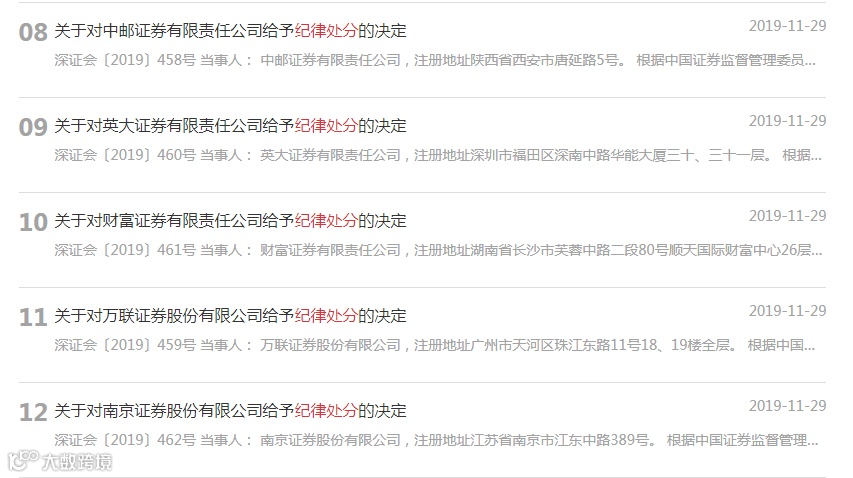 其实,这已经是最近一个月来,深交所发出的第二批暂停券商股票质押业务权限的罚单。时间倒回到11月29日,深交所在官网连续挂出5则纪律处分决定,暂停中邮证券、英大证券股票质押业务6个月,暂停财富证券、万联证券、南京证券股票质押业务3个月。