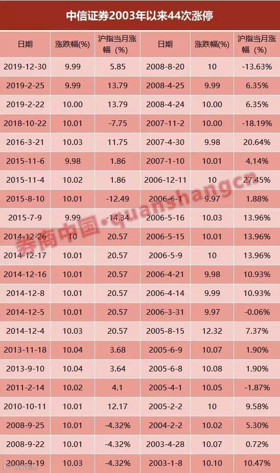 Wind数据显示,中信证券自2013年以来收盘涨停仅有44次。作为券商的龙头股,由于其市值大,中信证券通常不易涨停,而每次涨停几乎都是市场重要的信号。如果连续涨停,则信号更为显著。中信证券上一次连续涨停则发生在2014年12月16号和12月17日,此后催生了2015年的大牛市。