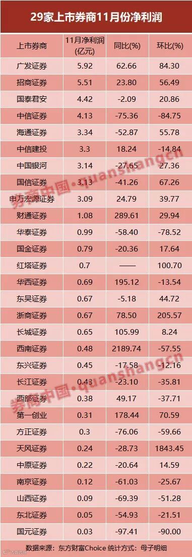 本月出现的业绩黑马当属广发证券,虽然长期保持着行业前十优等生的业绩水平,但其在11月份突飞猛进,单月实现净利润5.92亿元 摘得行业头名。