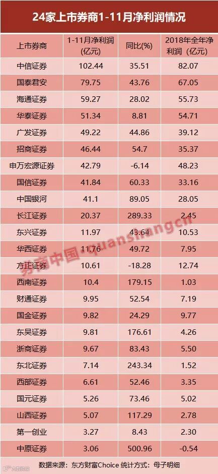 就具体排名来看,中信证券前11月已实现净利润102.44亿元,超出去年全年20亿元,国泰君安、海通证券、华泰证券三家1-11月净利润也超过50亿元,居于行业前列。