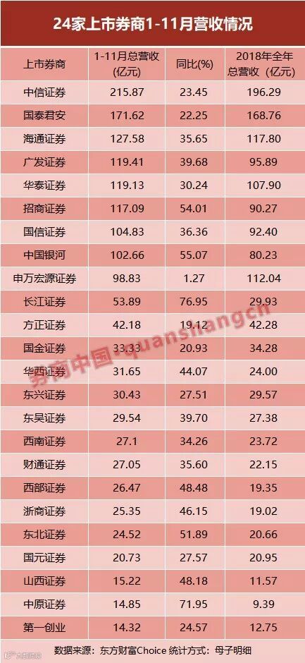 具体来看,在1-11月营收方面,中信证券以215.87亿元领跑行业,长期稳居头把交椅。国泰君安、海通证券等7家券商也均超过百亿水平。对比2018年情况来看,有同比数据的24家券商中,已有20家完成去年全年业绩;平均同比增幅达到38.12%,招商证券、银河证券、长江证券、东北证券、中原证券5家同比增幅甚至超过50%。