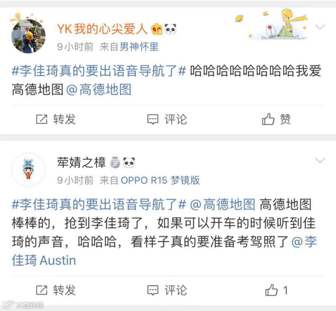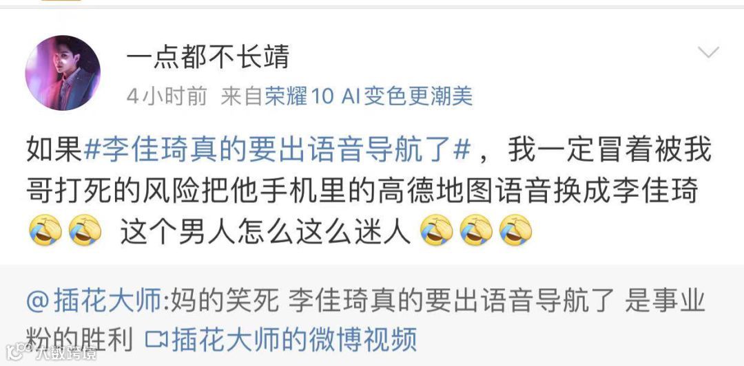 这条帖子得到了“所有女生”的赞同。没想到的是,这贴子被刷上热搜之后,事情竟然变成真的了。近日,李佳琦在一段视频中透露,已经有公司在跟自己接洽了:“为我事业操心的粉丝我真的好感谢你们,你们帮我怼上热搜之后,高德地图就立马来了,然后我们现在在聊当中,希望可以让女司机们亢奋起来,开车专心起来,不要打瞌睡。”