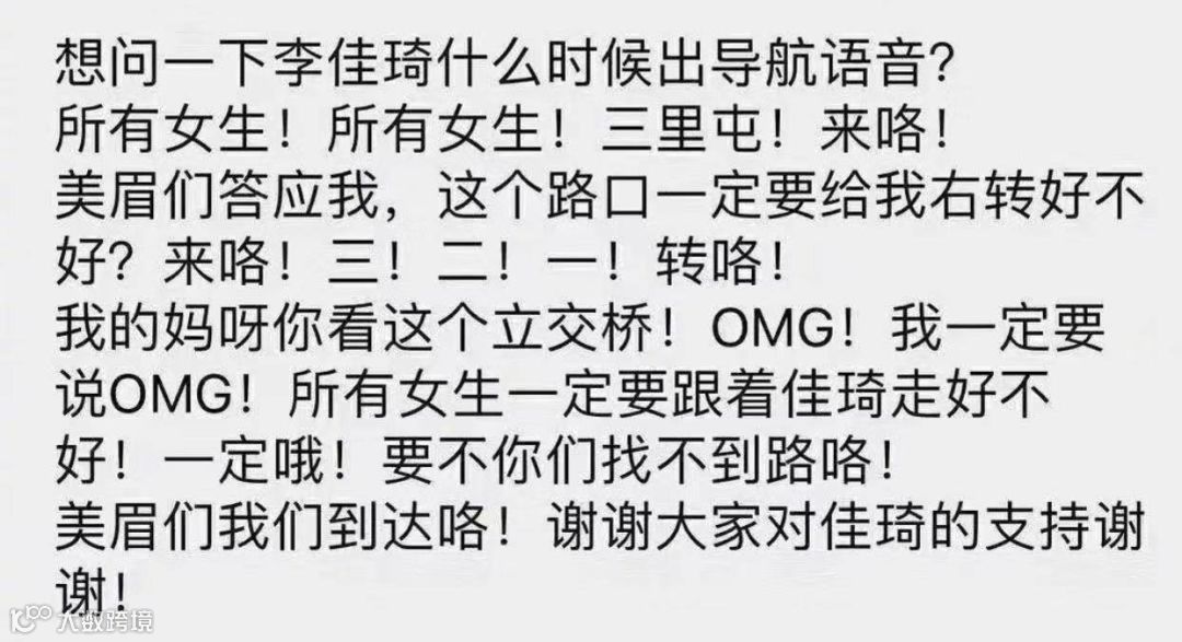 此前,网上流传着一个段子,设想如果李佳琦出导航语音,可能就再也不会迷路了,因为你听到的将是这样的指路模式: